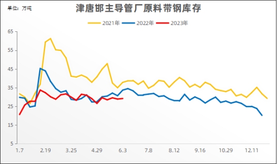 原料带钢 本周(6.2)厂内原料带钢库存29.1万吨,比上周同期增0.3万吨,增长1.04%;比上月同期降0.43万吨,下降1.46%;比去年同期降4.5万吨,下降13.39%。