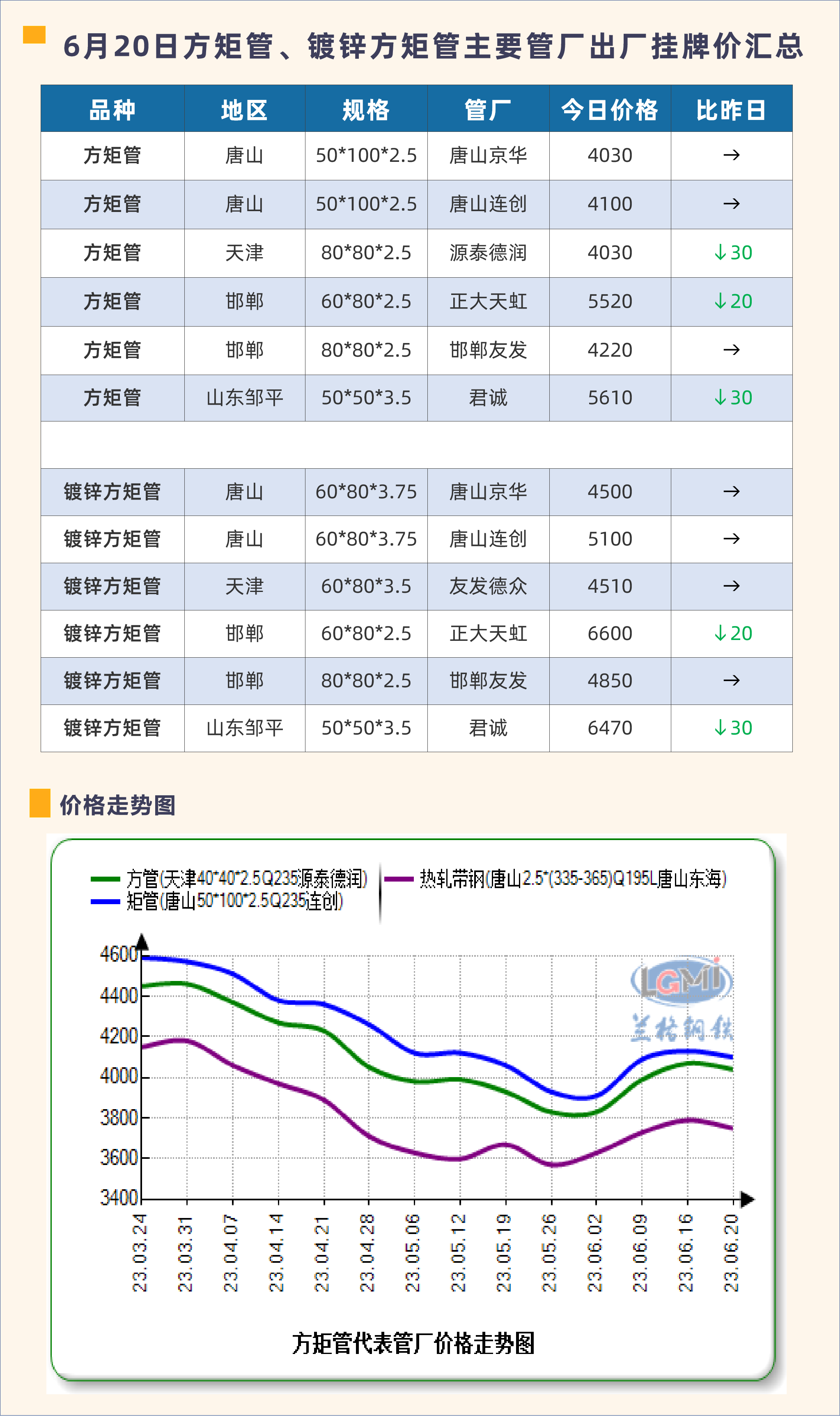 • 6月20日方矩管、镀锌方矩管主要管厂出厂挂牌价汇总