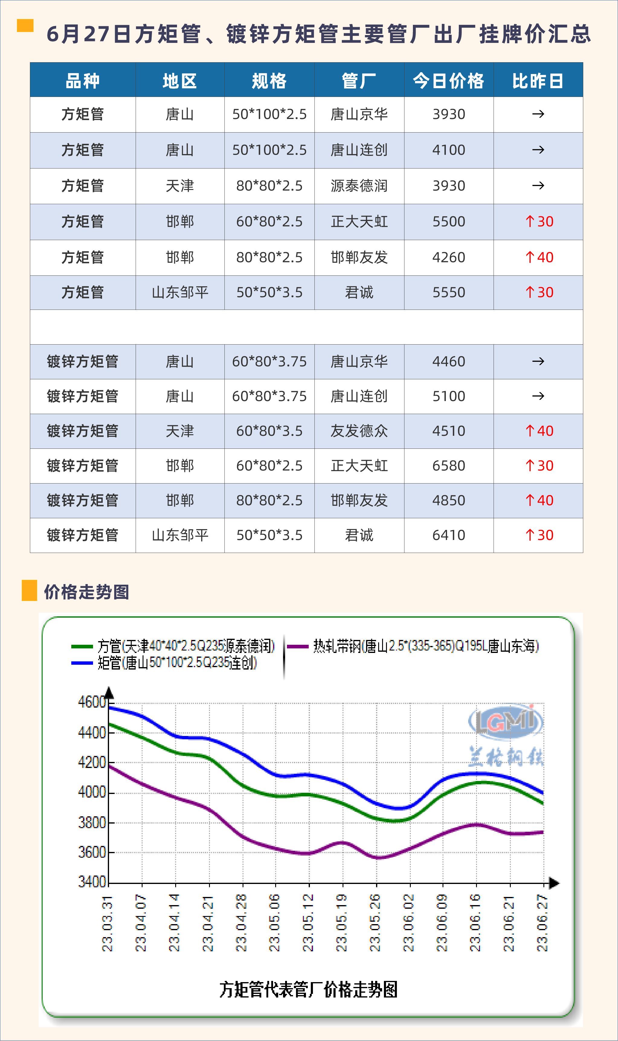 • 6月27日方矩管、镀锌方矩管主要管厂出厂挂牌价汇总