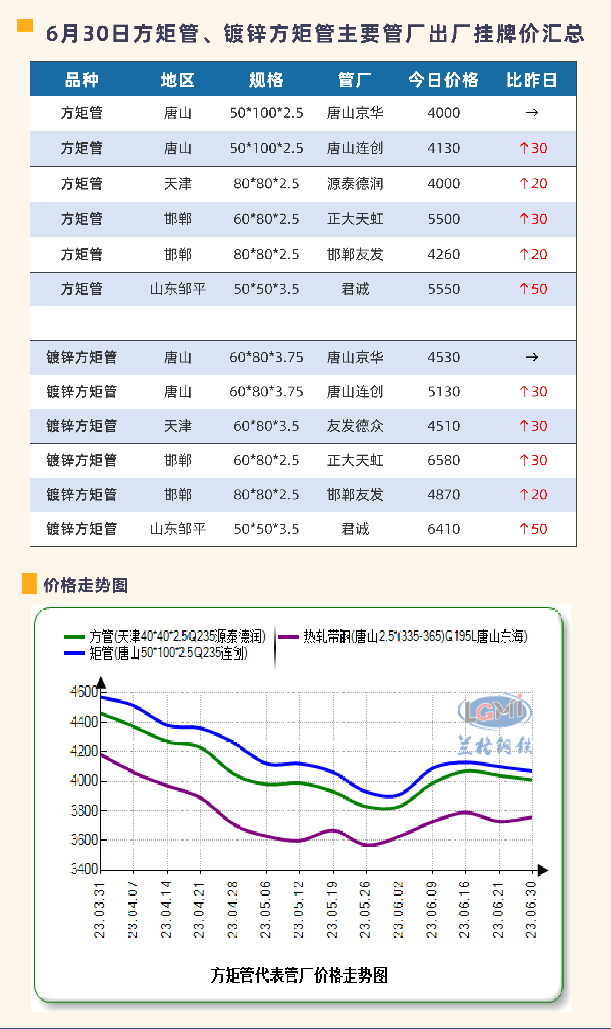 • 6月30日方矩管、镀锌方矩管主要管厂出厂挂牌价汇总