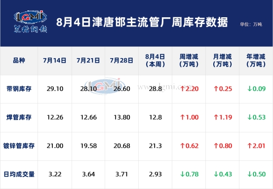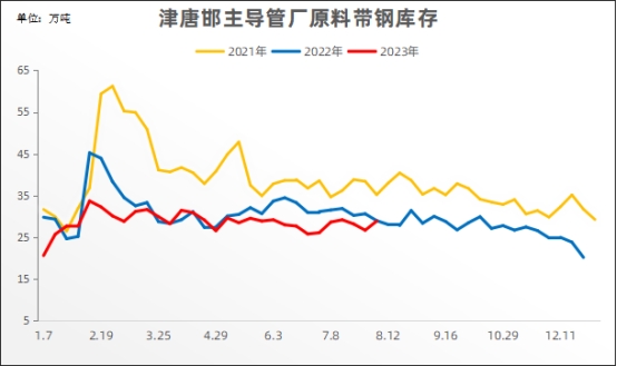 原料带钢 本周(8.4)管厂原料带钢库存28.8万吨,比上周同期增2.2万吨,增长8.27%;比上月同期增0.25万吨,增长0.88%;比去年同期降0.09万吨,下降0.31%。