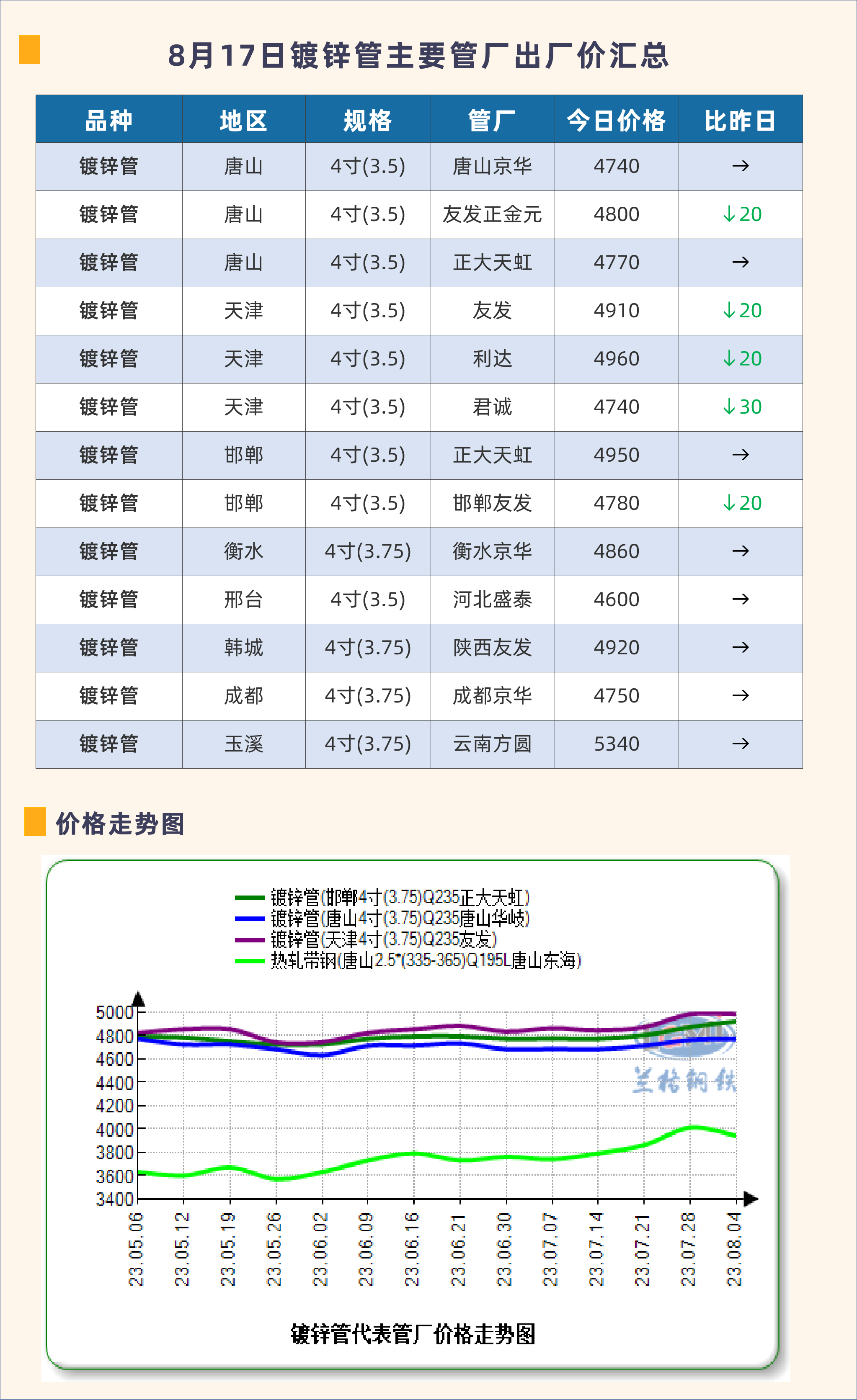• 8月17日天津友发钢管集团股份有限公司第一分公司出厂价下调20元