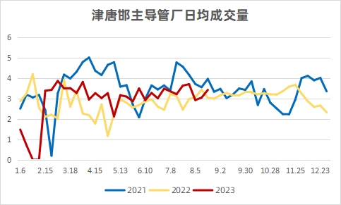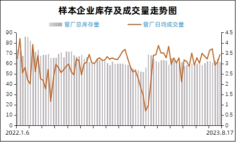 日均成交量 本周(8.18)管厂日均成交量3.43万吨,比上周同期增0.38万吨,增长12.46%;比上月同期减0.21万吨,下降5.77%;比去年同期增0.43万吨,增长14.33%。