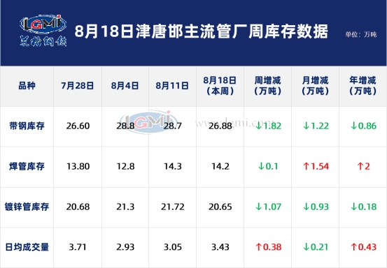 原料带钢 本周(8.18)管厂原料带钢库存26.88万吨,比上周同期降1.82万吨,下降6.34%;比上月同期降1.22万吨,下降4.34%;比去年同期降0.86万吨,下降3.1%。