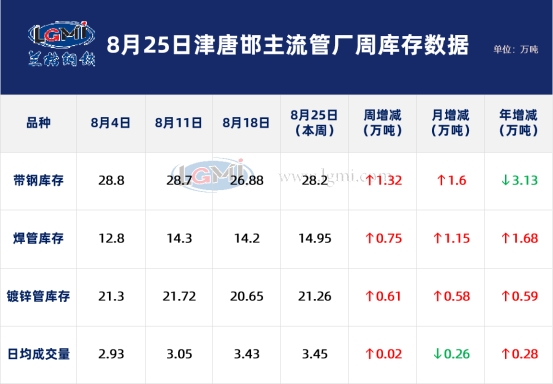 本周主导管厂库存数据变化 本周(8.25)管厂总库存64.41万吨,比上周同期增2.68万吨,比上月同期增3.33万吨,比去年同期减0.86万吨,比2021年同期减18.16万吨。