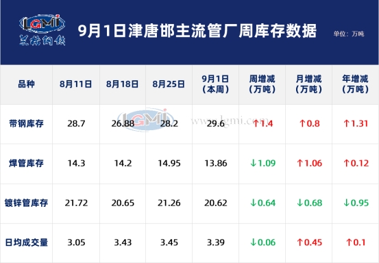原料带钢 本周(9.1)管厂原料带钢库存29.6万吨,比上周同期增1.4万吨,增长4.96%;比上月同期增0.8万吨,增长2.78%;比去年同期增1.31万吨,增长4.63%。
