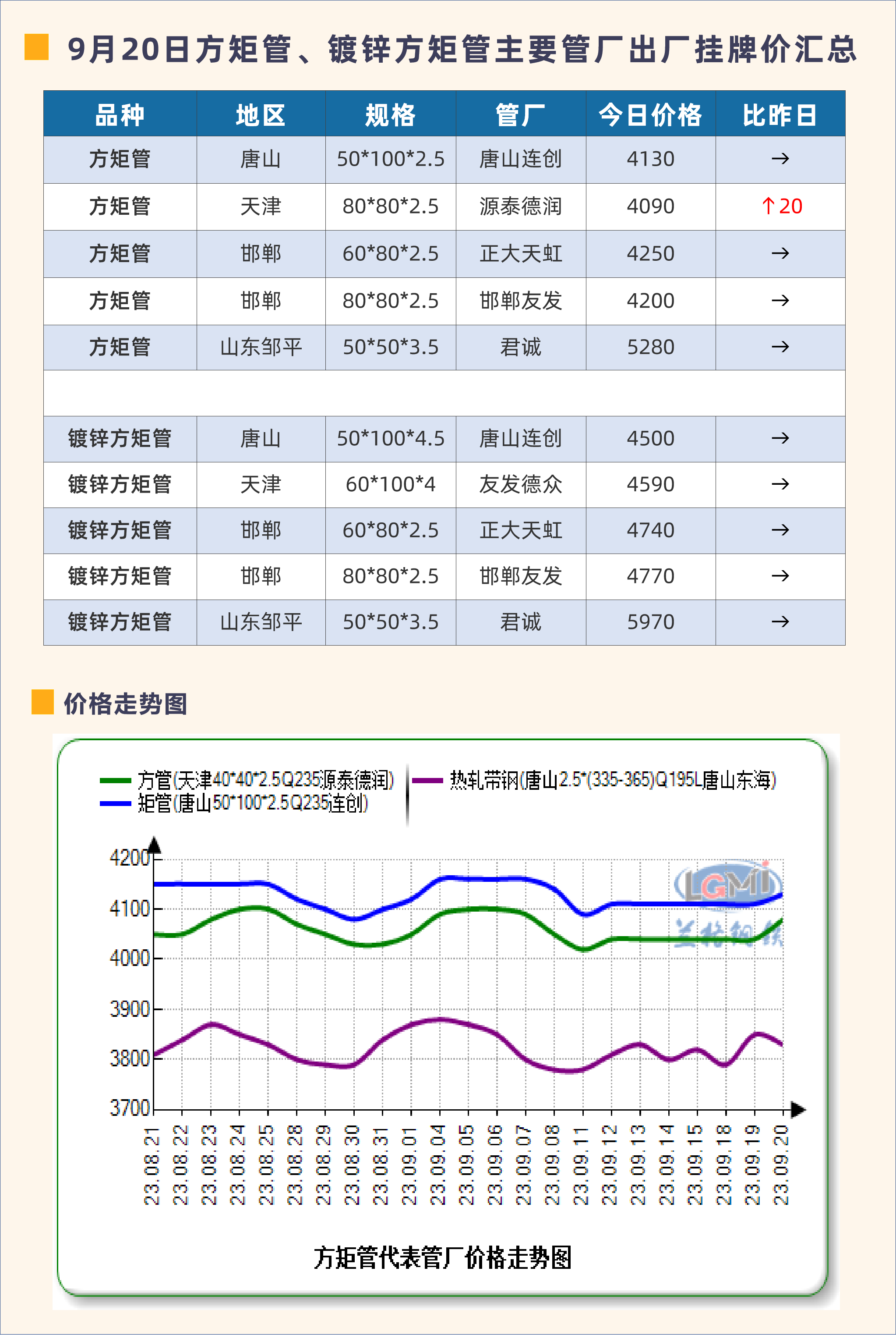 • 9月20日方矩管、镀锌方矩管主要管厂出厂挂牌价汇总