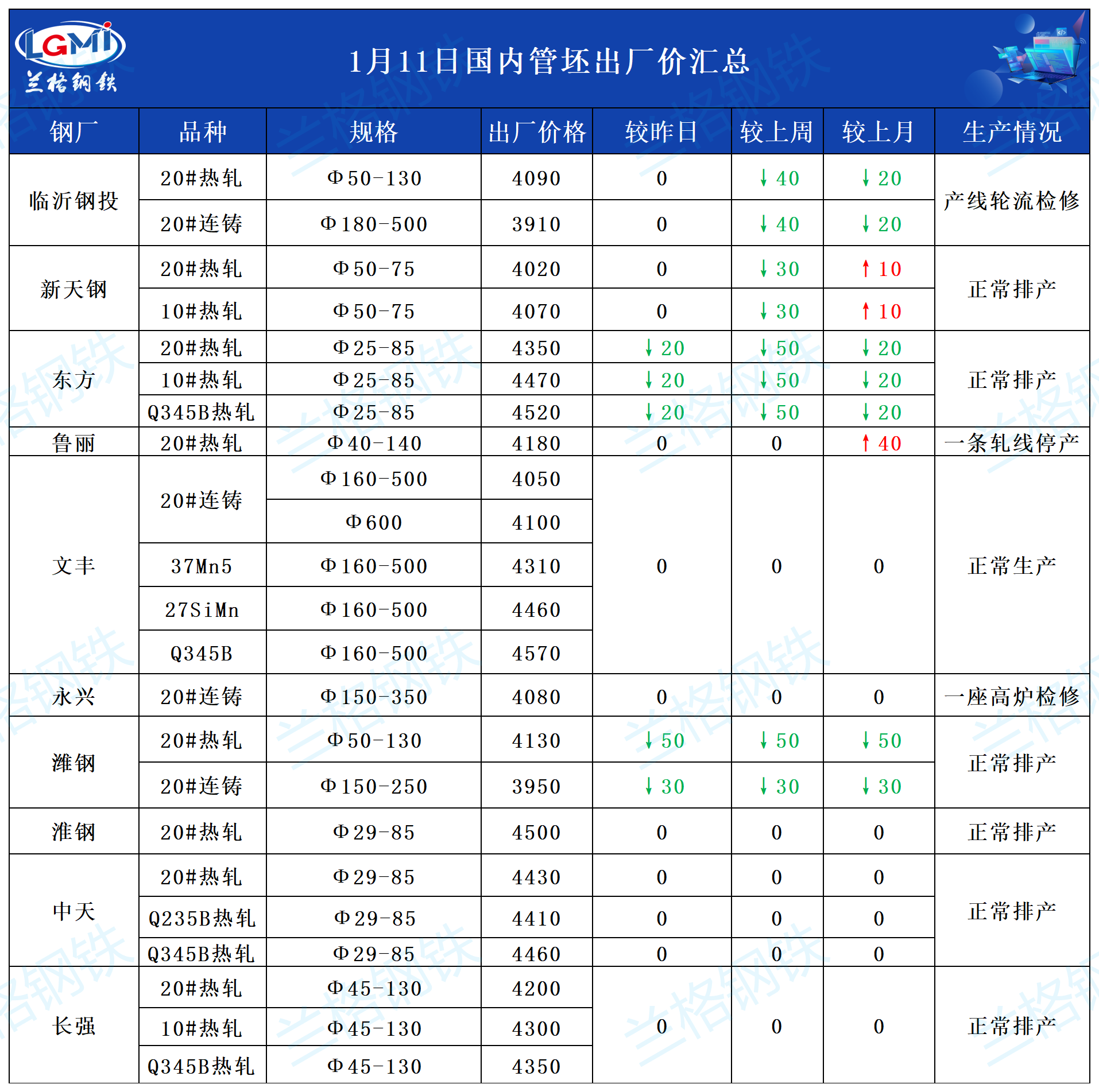 • 1月11日主导钢厂20#热轧管坯出厂价