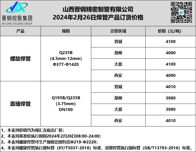 2月26日山西晋钢焊管产品订货价格