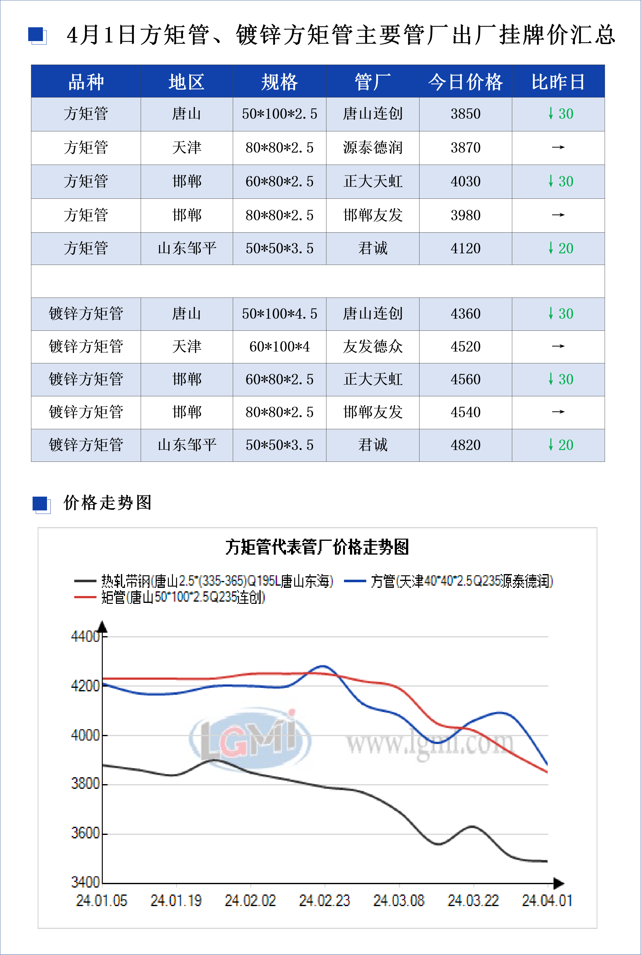 • 4月1日方矩管、镀锌方矩管主要管厂出厂挂牌价汇总