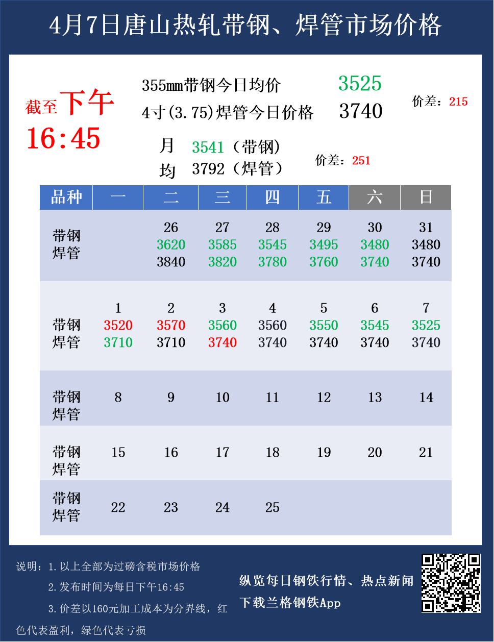 • 4月7日(16:45)唐山热轧带钢、焊管市场价格