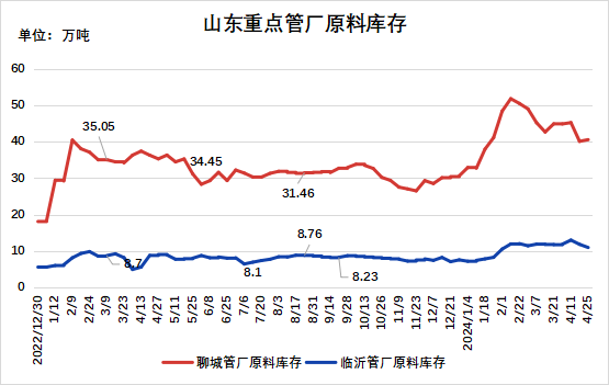 截至4月25日,据兰格调研,山东地区样本管厂管坯总库存51.48万吨,较上周减少0.41万吨。随着焦炭等原料价格不断上涨,钢厂管坯价格上探意愿增强,导致厂家对于前期低价接的管坯订单交付节奏放缓,而管厂产能处于持续恢复中,整体对于坯料的消耗增加,进而导致了厂内原料库存减量明显。