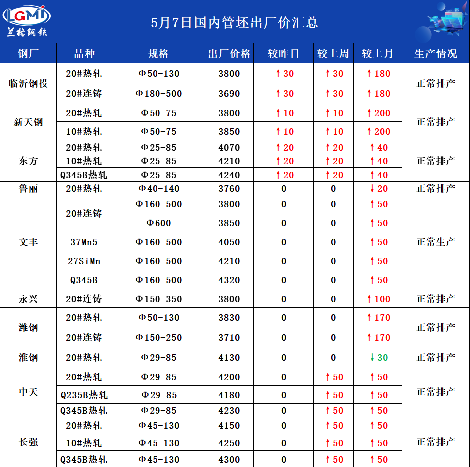 • 5月6日主导钢厂20#热轧管坯出厂价(11:00)