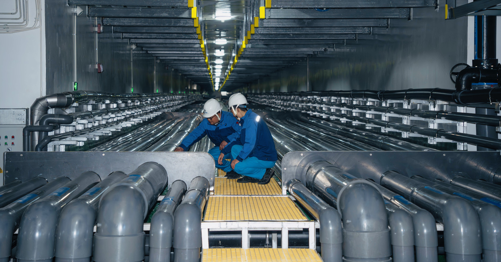 走进园区,在地下9米的废水处理中心负二层,17根粗细不同的管道上,分别标注着“含铬废水、含镉废水、综合废水”等不同标签。在这里,记者见到了园区技术负责人张国田,此时他正在进行设备巡检。