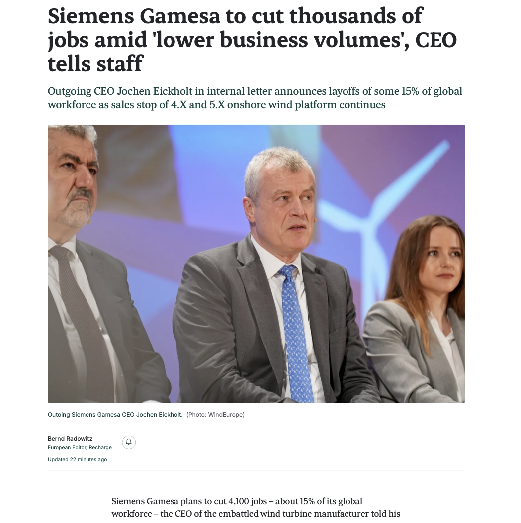 裁员的不止西门子歌美飒,就在上个月,刚刚完成分拆上市的GE Vernova也计划大规模裁员。裁员将主要集中在风电叶片板块,计划将有1000人被裁,其目的是提高公司盈利能力。
