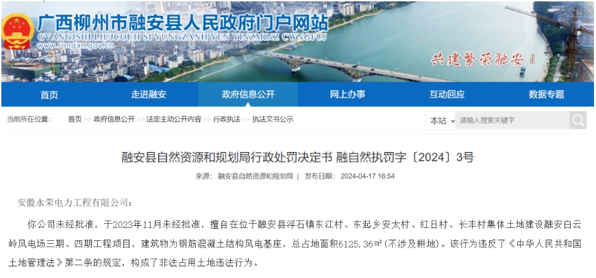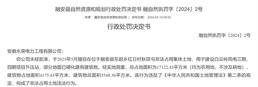 日前,广西融安县自然资源和规划局发布的行政处罚决定书显示,安徽永荣电力工程有限公司未经批准,于2023年11月未经批准,擅自在位于融安县浮石镇东江村、东起乡安太村、红日村、长丰村集体土地建设共计装机300MW风电项目,建筑物为钢筋混凝土结构风电基座,总占地面积6125.36㎡(不涉及耕地)。该行为违反了《中华人民共和国土地管理法》第二条的规定,构成了非法占用土地违法行为。