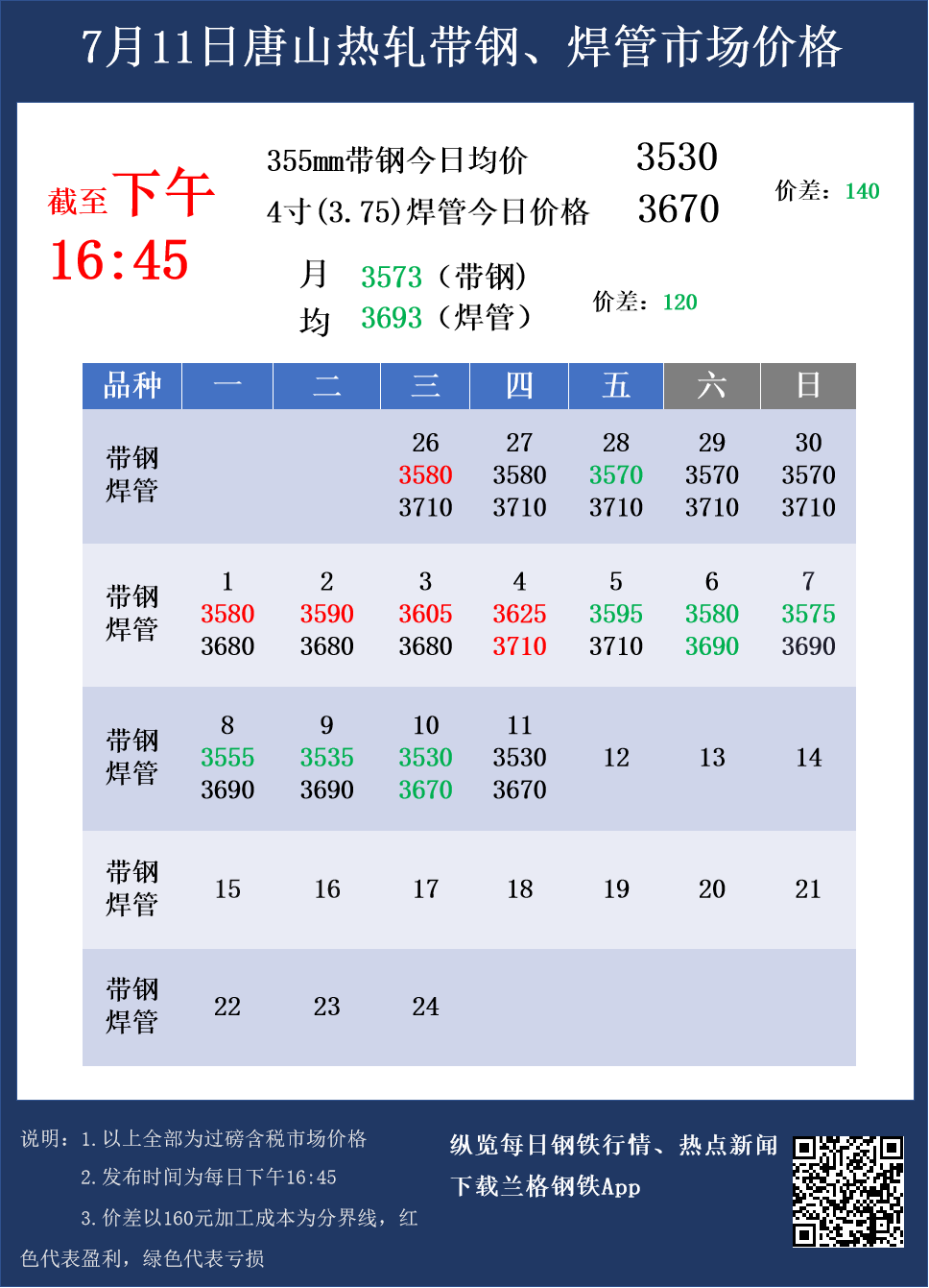 • 7月11日(16:45)唐山热轧带钢、焊管市场价格