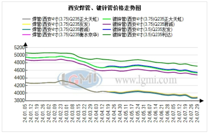 今日西安管材市场价格小幅下降,较上个交易日成交一般。兰格钢铁云商平台监测数据显示,截至2024年7月29日,4寸(3.75)焊管过磅含税价:友发报3900元,正大报3890元,衡水京华3880元,君诚报3870元,比上个交易日稳;4寸(3.75) 镀锌管过磅含税价:利达报4710元,友发报4550元,正大报4530元,君诚报4480元,衡水京华报4480元,比上个交易日跌20元。