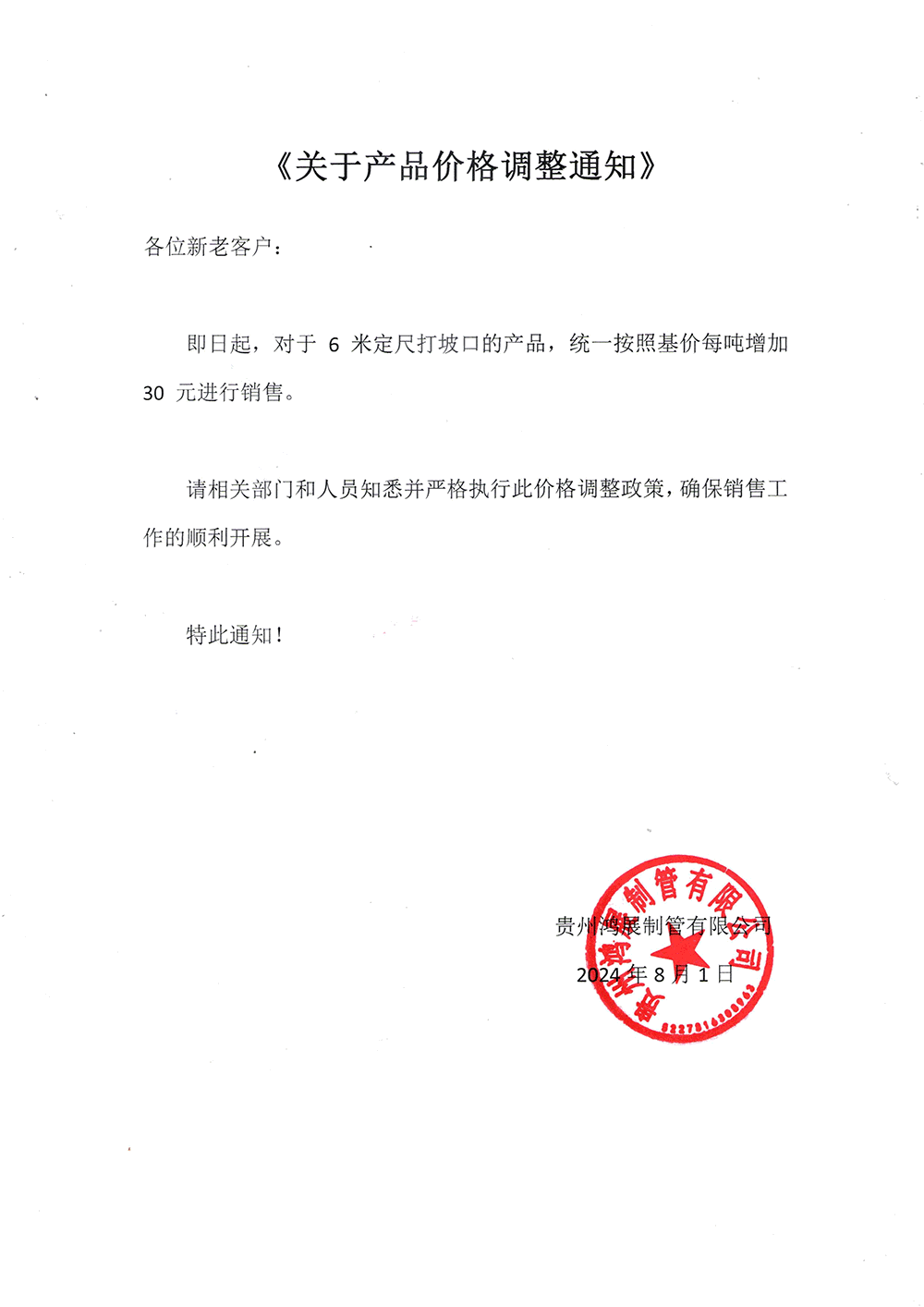即日起,对于6米定尺打坡口的产品,统一按照基价每吨增加30元进行销售。请相关部门和人员知悉并严格执行此价格调整政策,确保销售工作的顺利开展。