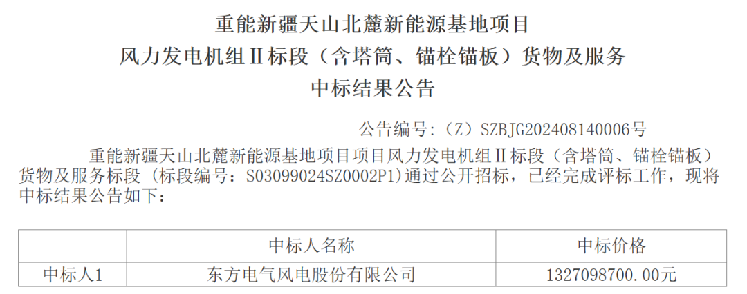 8月14日,华润电力发布重能新疆天山北麓新能源基地项目风力发电机组Ⅲ标段、Ⅱ标段、Ⅲ标段(含塔筒、锚栓锚板)货物及服务中标结果公告。