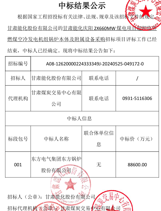 10月9日,甘肃省公共资源交易中心发布甘肃能化庆阳2X660MW煤电项目超超临界燃煤空冷发电机组三大主机中标结果公示,东方电气集团东方锅炉股份有限公司中标锅炉本体及附属设备采购,中标价:88600万元。