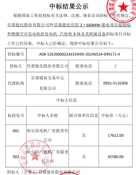 甘肃能化庆阳2×660MW煤电项目三大主机中标结果公示