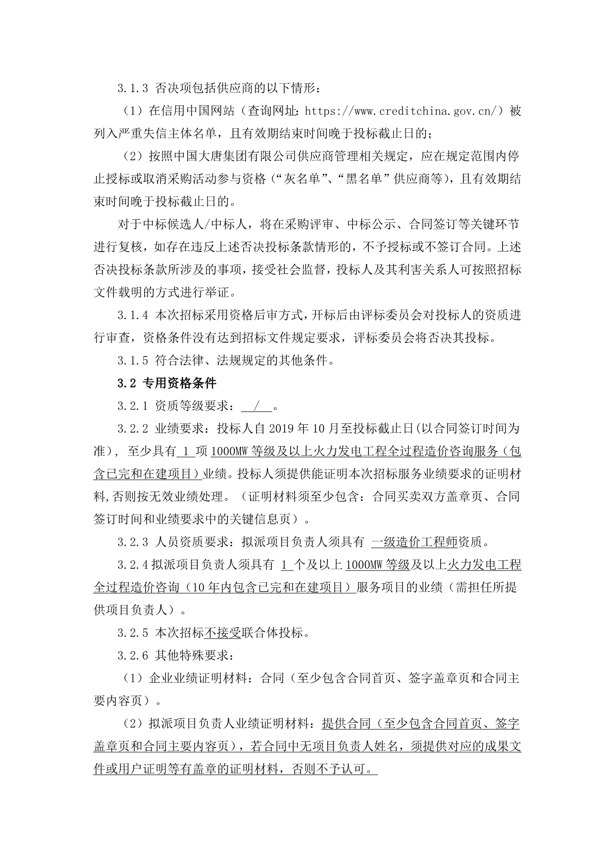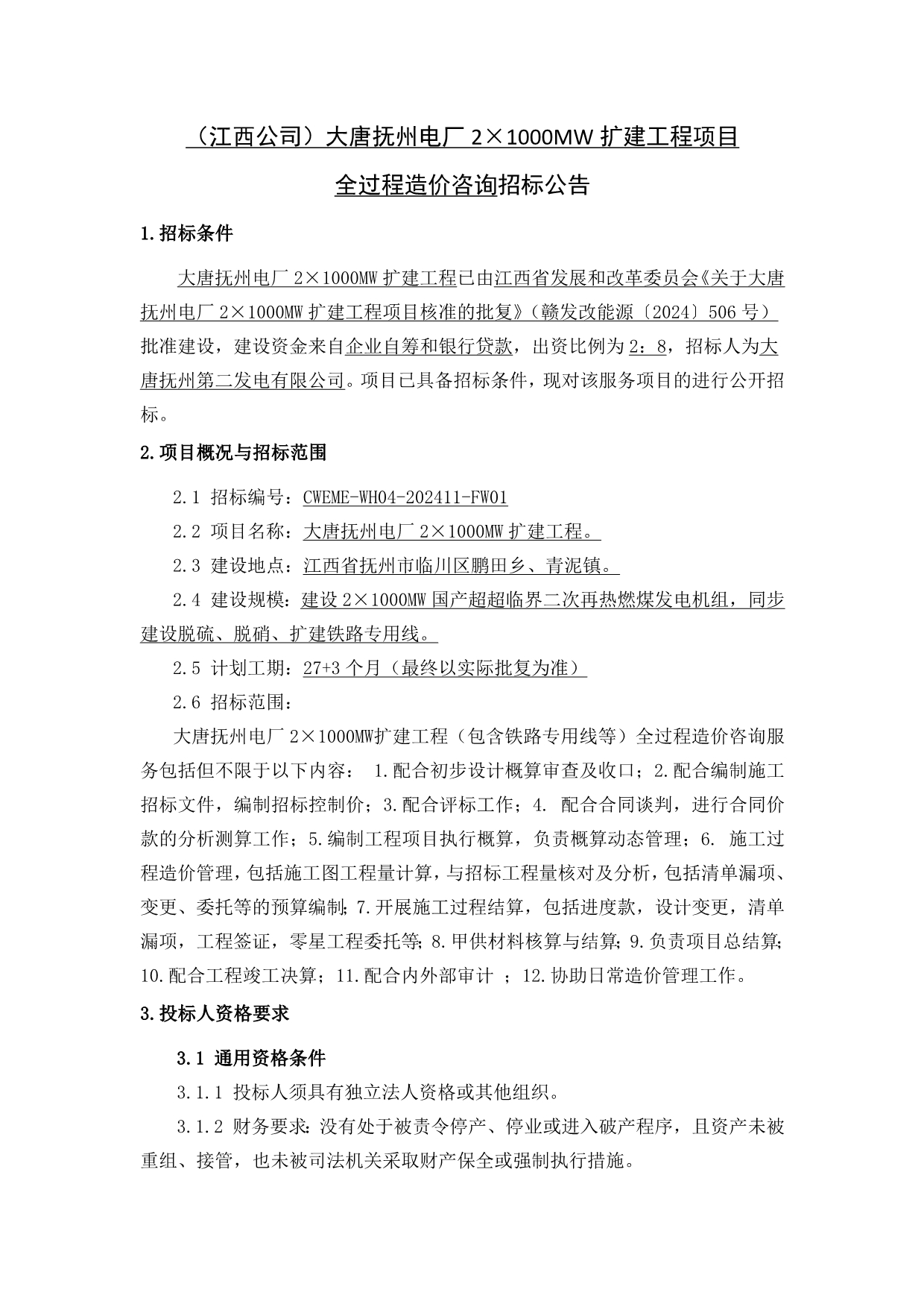 大唐抚州电厂2×1000MW扩建工程项目全过程造价咨询招标