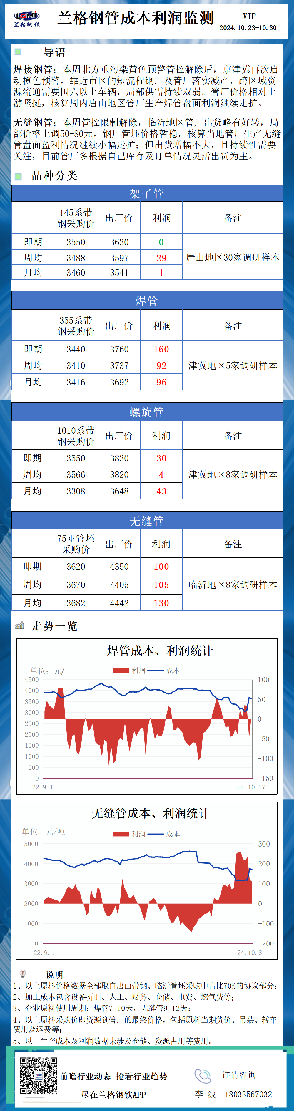 兰格调研:钢管成本利润监测(10月31日)