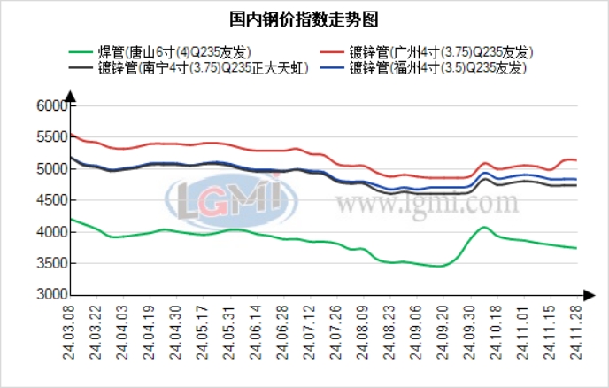 十一月华南地区焊管价格震荡盘整运行为主。国庆后华南焊镀管市场价格在国家出台各项重磅政策加持下点燃市场情绪,期货强势上涨,地方现货价格在短时间内回补了近三个月的跌幅。在政策落地前,市场高预期与现实存在较大差异导致期货市场发生多空双杀的走势,三季度月钢材市场整体为阴跌走势。同时国内终端市场开工周期普遍延后,以及资金不能及时落实到位,导致“金九”惨淡收场。国庆前夕国家相继出台金融、货币、外贸、地产等多条利好政策,为钢材市场价格起到了一定的托底效应,同时期货市场吸引了可观的增量资金进场,现阶段主要还是以情绪引导以及政策性引导成为后续市场走势的关键。