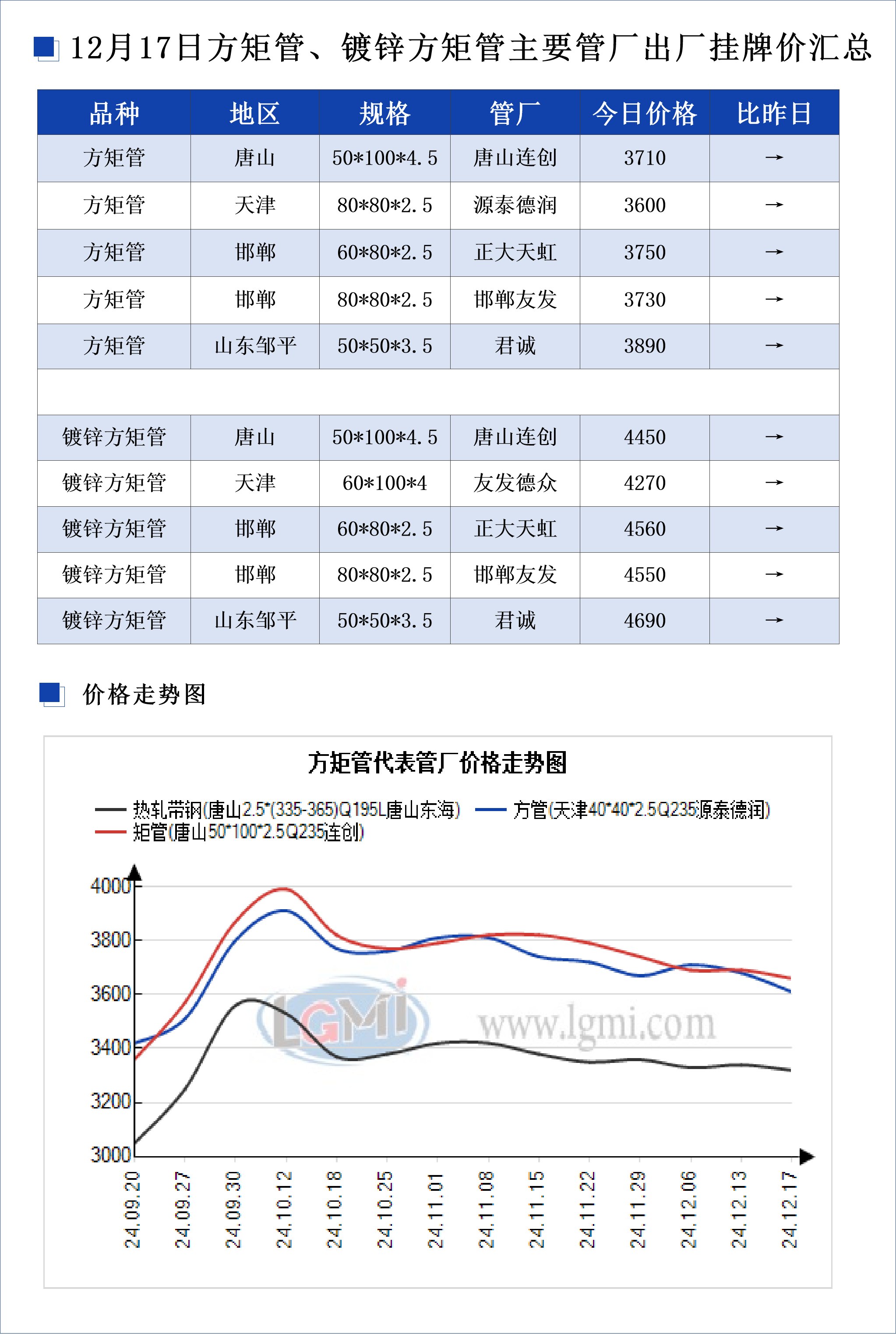 • 12月17日方矩管、镀锌方矩管主要管厂出厂挂牌价汇总