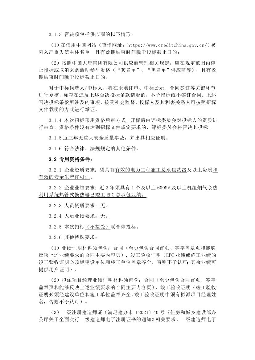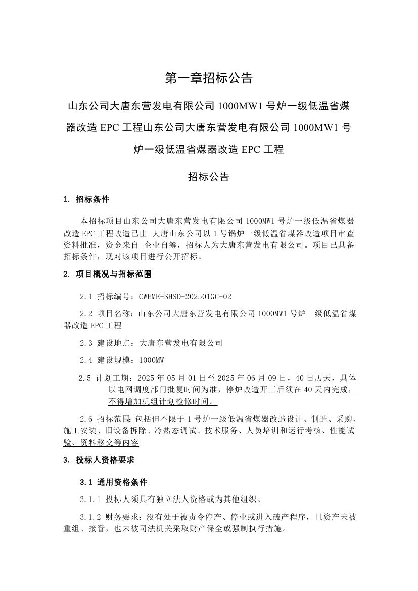 大唐东营1000MW1号炉一级低温省煤器改造EPC工程招标公告