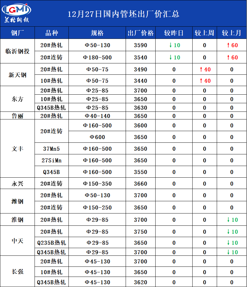 • 12月27日主导钢厂20#热轧管坯出厂价(11:00)