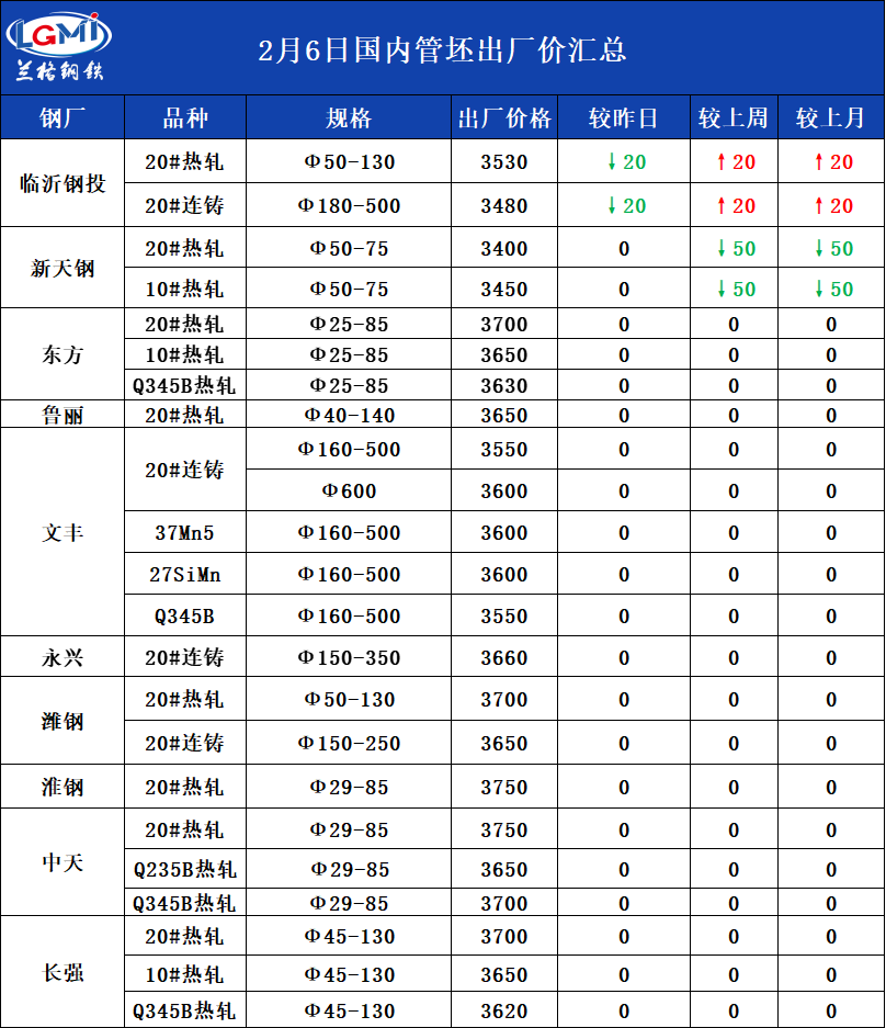 • 2月6日主导钢厂20#热轧管坯出厂价(11:00)
