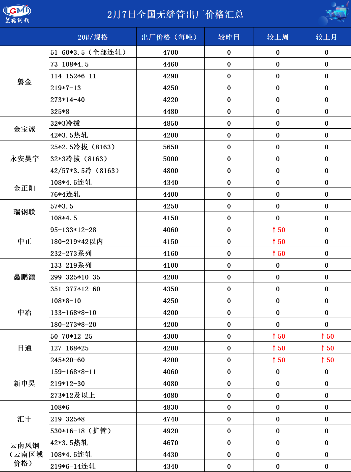• 2月7日主导钢厂20#热轧管坯出厂价(11:00)