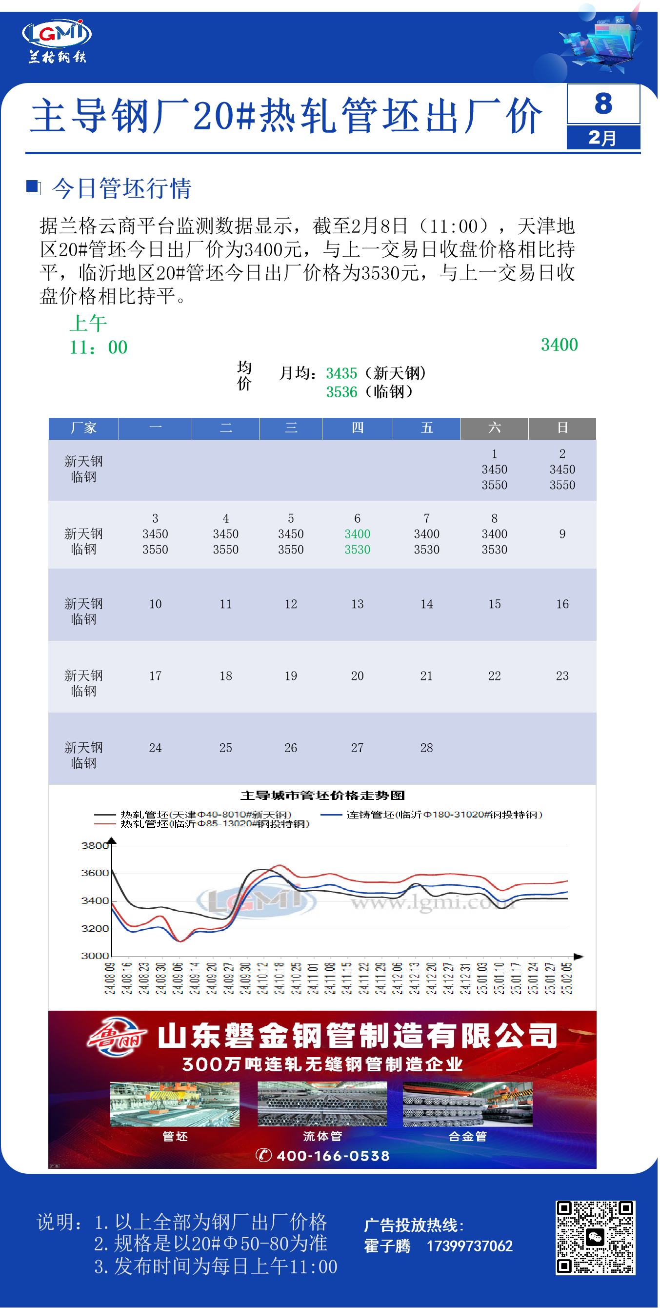 2月8日主导钢厂20#热轧管坯出厂价(11:00)