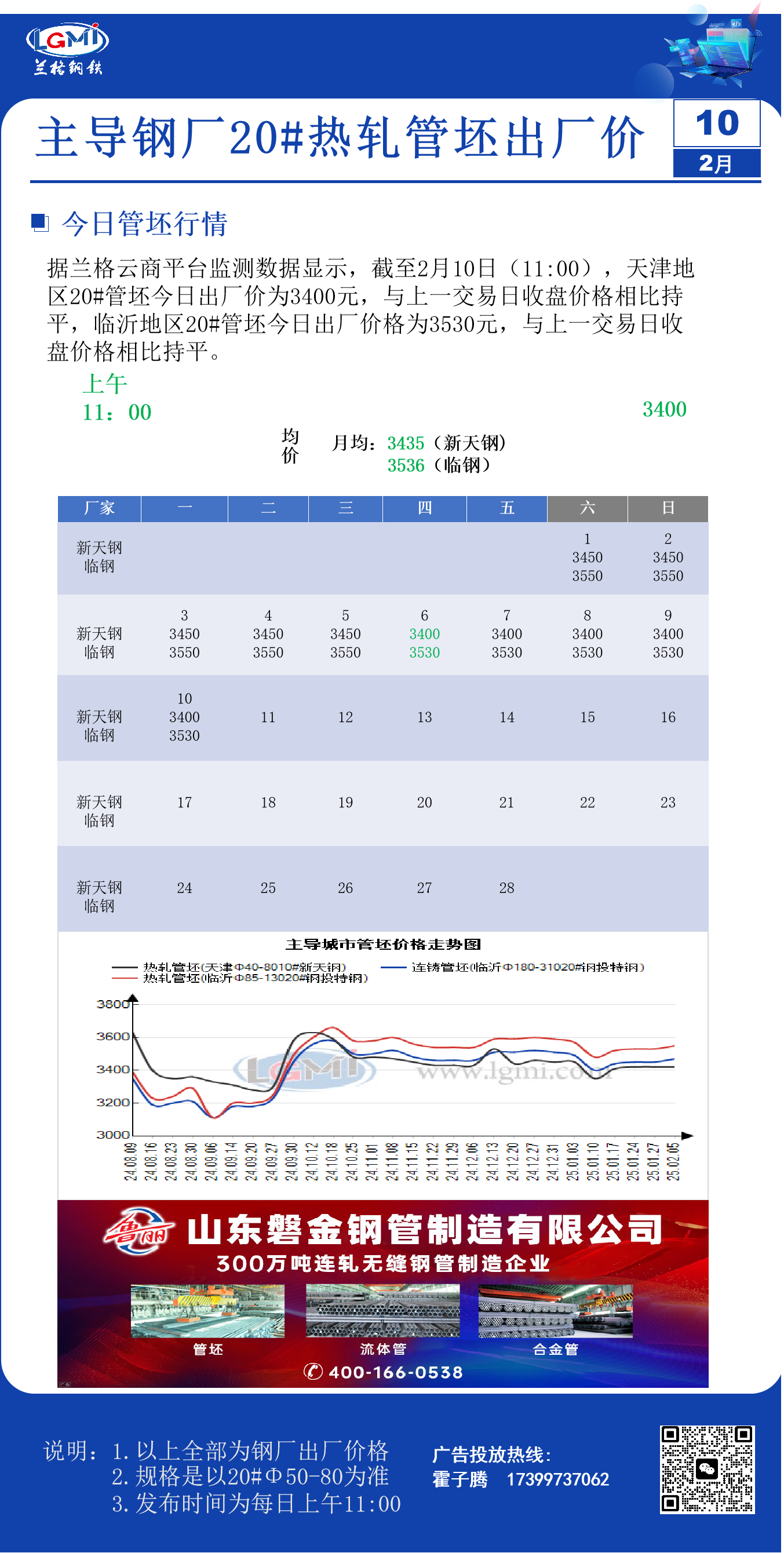 2月10日主导钢厂20#热轧管坯出厂价(11:00)
