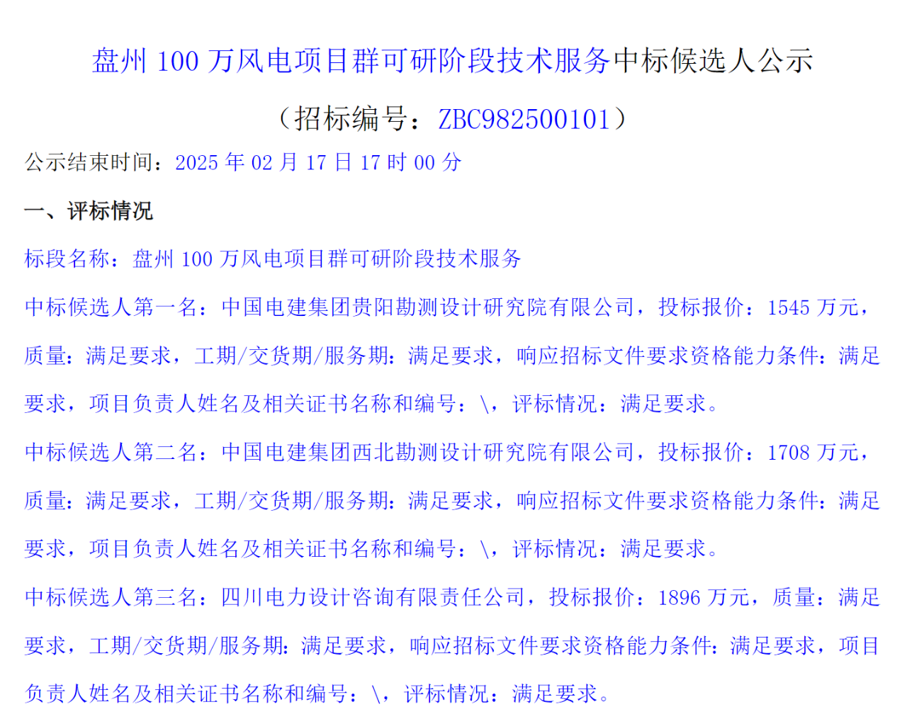 2月13日,盘州100万千瓦风电项目群可研阶段技术服务中标候选人公示,中国电建集团贵阳勘测设计研究院有限公司预中标,投标报价1545万元。