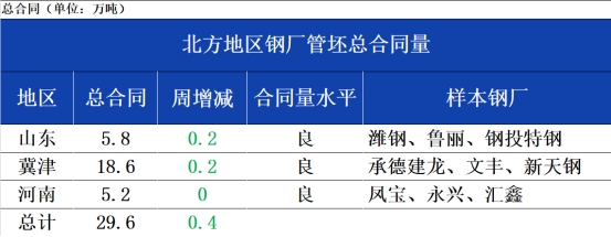 本周北方地区9家钢厂管坯手持总合同量29.6万吨,较上周同期下降0.4万吨。本周新合同接单量小幅减少,主要因为下游缓慢复工,下游恢复生产为主。