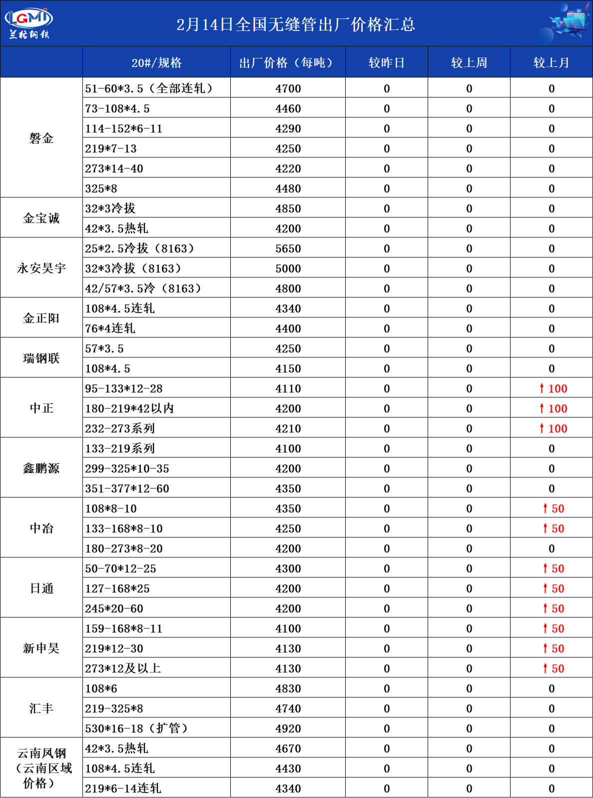• 2月14日主导钢厂20#热轧管坯出厂价(11:00)