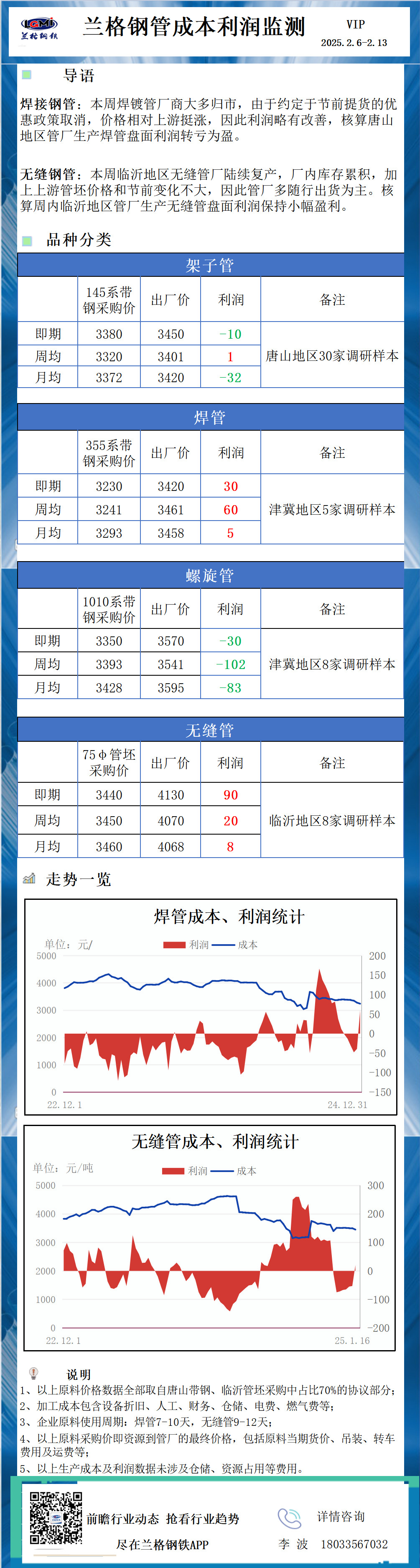 兰格调研:钢管成本利润监测(2月14日)