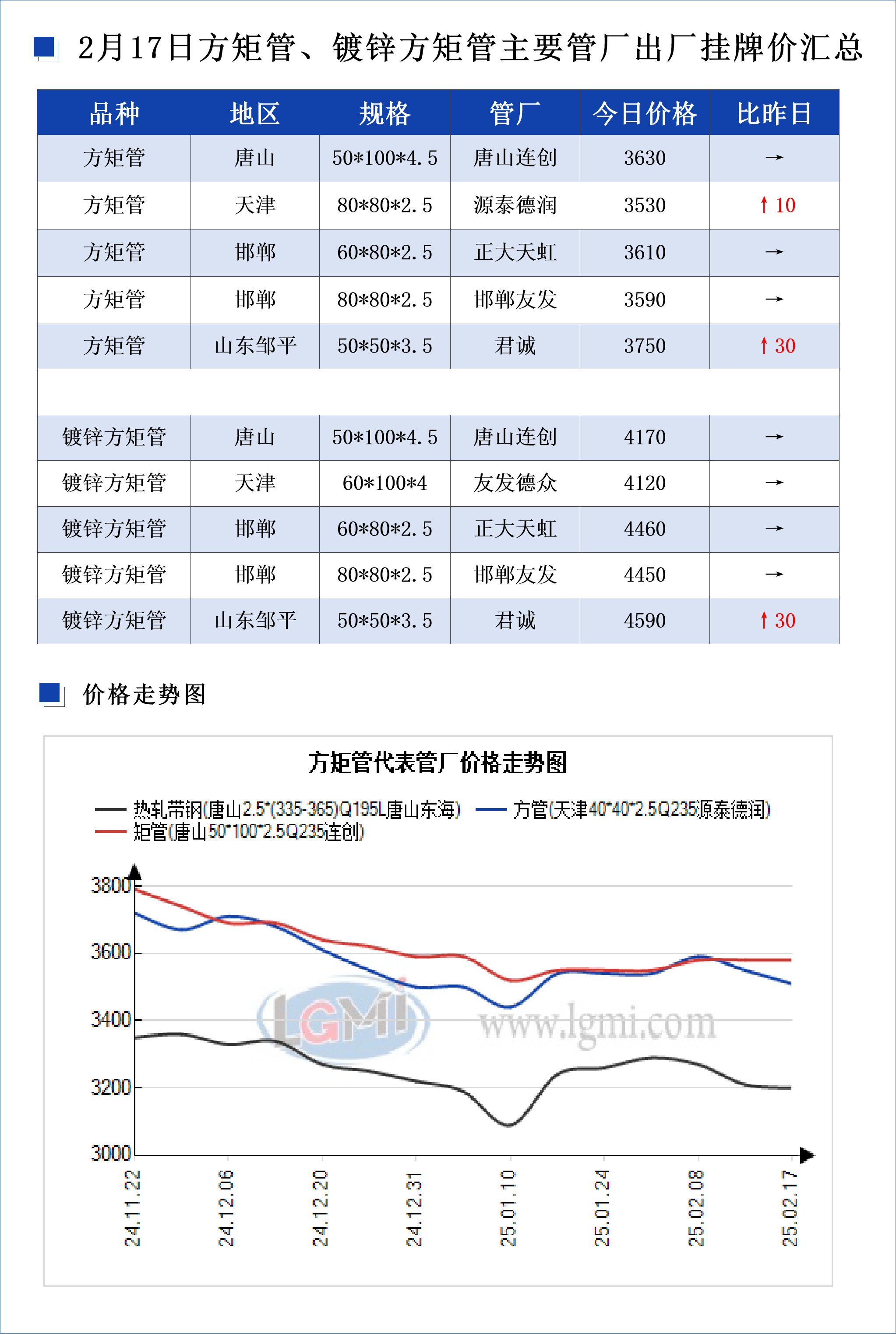 • 2月17日方矩管、镀锌方矩管主要管厂出厂挂牌价汇总