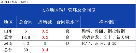 本周北方地区9家钢厂管坯手持总合同量30万吨,较上周同期上涨0.4万吨。本周新合同接单量小幅上涨,主要因为期螺方面走势较好,下游逐渐恢复生产为主。