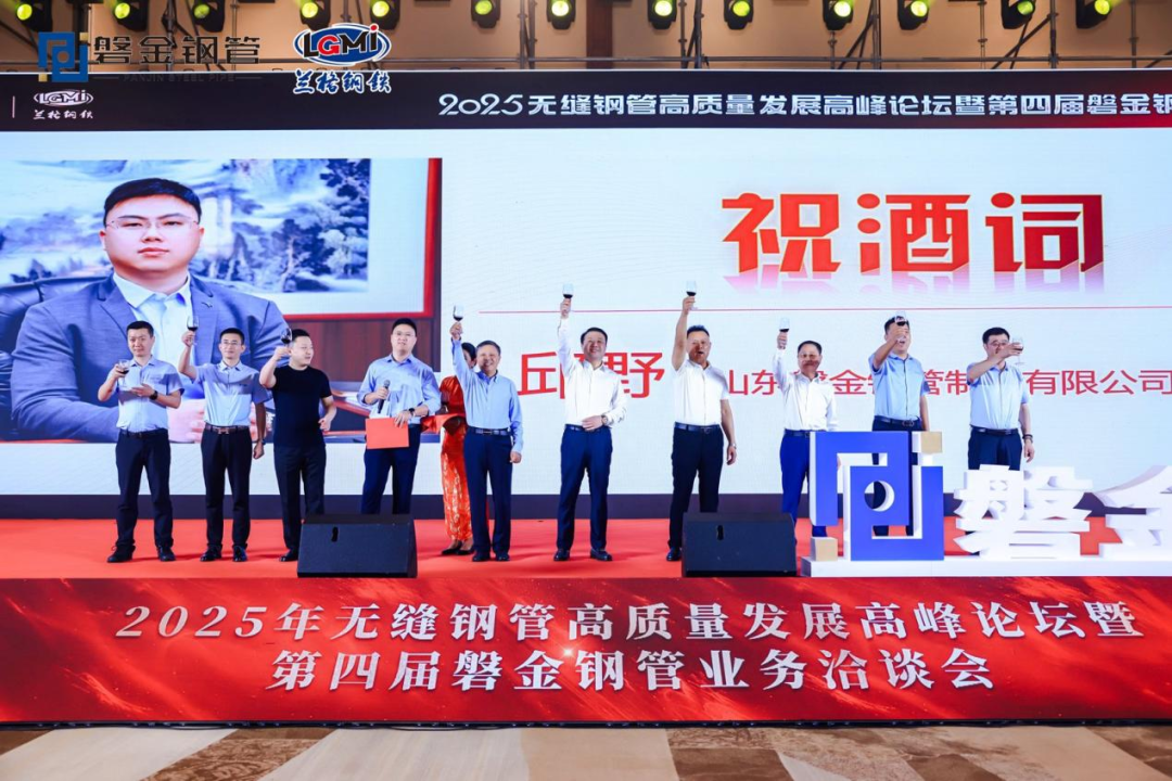 △山东磐金钢管制造有限公司副总经理邱野 鲁丽集团党委书记薛明亮,党委副书记、冶金板块董事长傅士刚,兰格集团董事长刘长庆、总裁刘陶然,鲁丽集团冶金板块副总经理马清文、魏文升,山东磐金钢管制造有限公司副总经理张勇、邱野,鲁丽集团冶金板块总经理助理高全宗,兰格钢铁网总经理兼首席分析师马力等领导共同上台祝酒。
