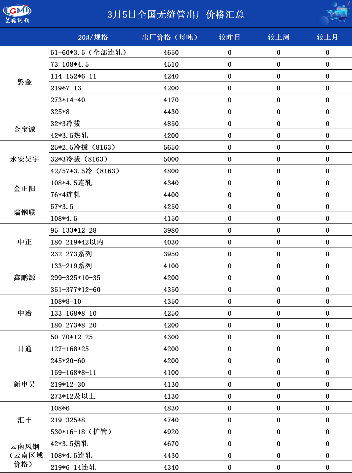 • 3月5日主导钢厂20#热轧管坯出厂价(11:00)