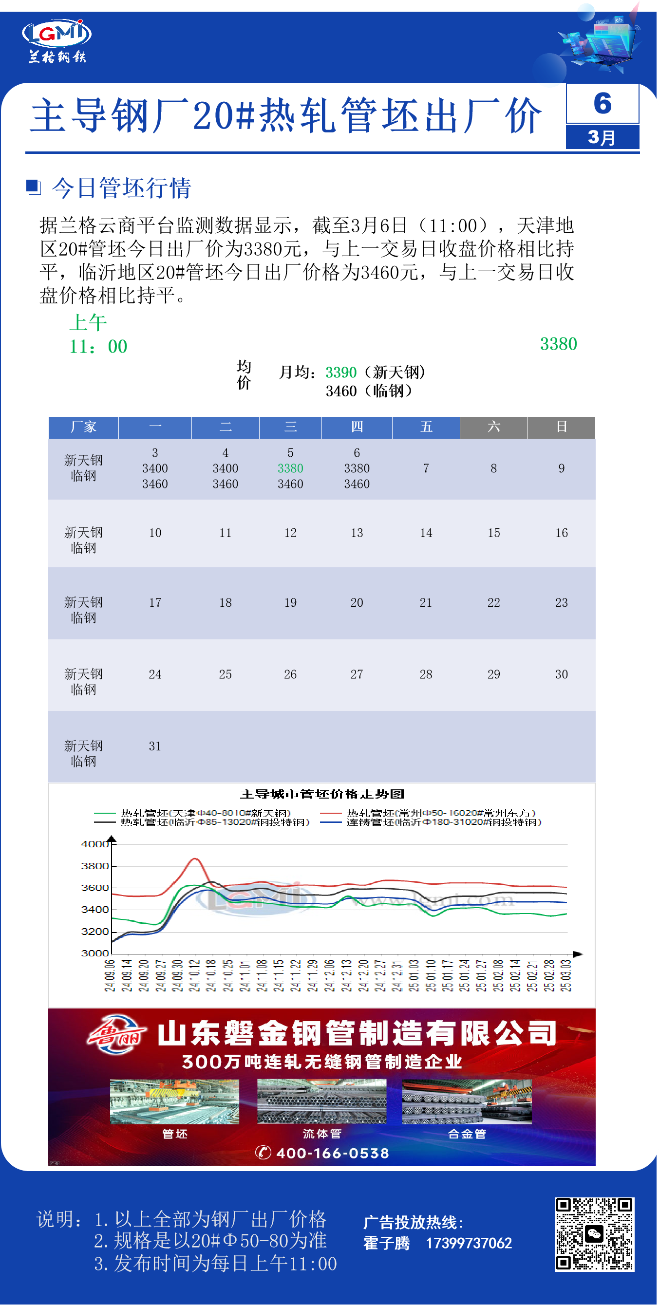 • 3月6日主导钢厂20#热轧管坯出厂价(11:00)