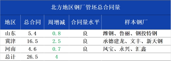本周北方地区9家钢厂管坯手持总合同量26.5万吨,较上周同期下跌4万吨。本周新合同接单量小幅减少,主要因为北方环保限产等原因开工率大幅下降,下游库存充裕为主。