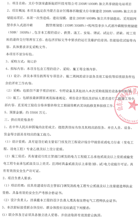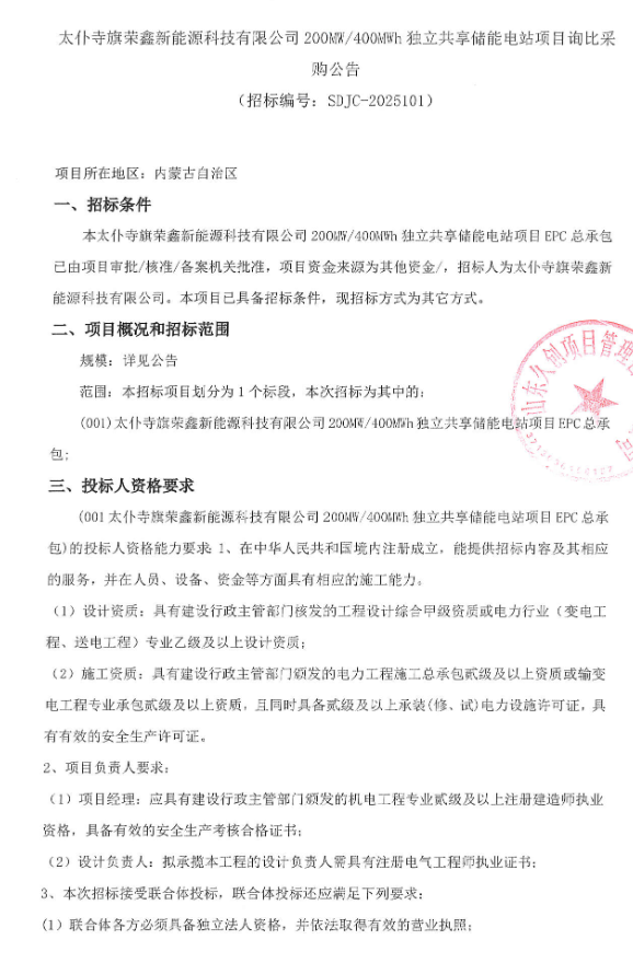 北极星储能网讯:3月17日,太仆寺旗荣鑫新能源科技有限公司发布200MW/400MWh独立共享储能电站项目EPC总承包招标公告,该项目位于内蒙古自治区锡林郭勒盟太仆寺。太仆寺旗荣鑫新能源科技有限公司为北京宏源能科新能源有限公司的全资子公司。