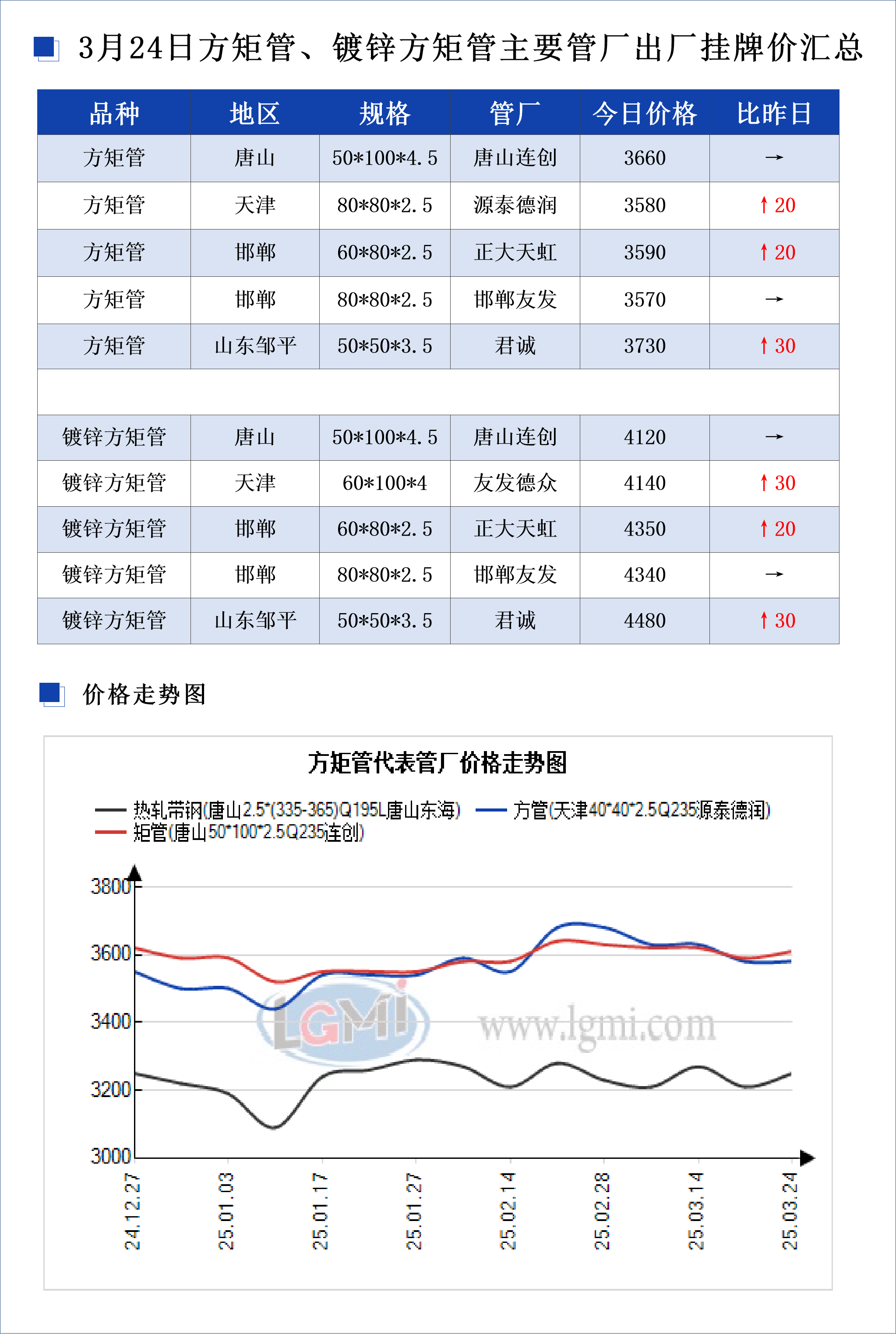 • 3月24日方矩管、镀锌方矩管主要管厂出厂挂牌价汇总