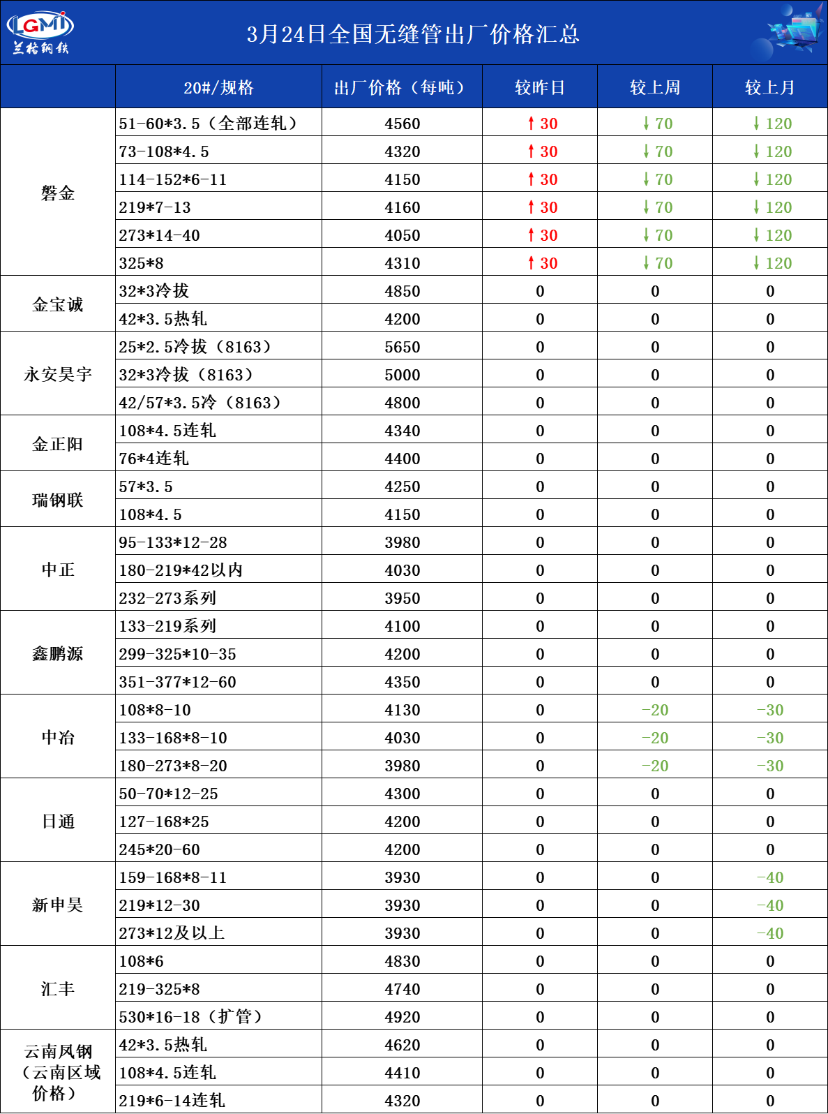 • 3月24日主导钢厂20#热轧管坯出厂价(11:00)