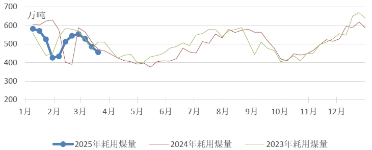 根据中电联电力行业燃料统计,截至3月20日,纳入统计的发电集团燃煤电厂本月累计发电量同比下降4%,本年累计发电量同比下降8%。燃煤电厂耗煤量本月累计同比下降4.1%,本年累计同比下降7%。燃煤电厂煤炭库存高于去年同期440万吨,库存可用天数较上年同期升高1.8天。